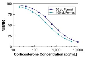 Users can opt for 50 μL of input for an expected sensitivity of 26.2 pg/mL or 100 μL for 17.9 pg/mL. Detailed instructions are available in the kit insert, which should be read thoroughly before running the assay. The kit includes a corticosterone standard to create a precise standard curve.